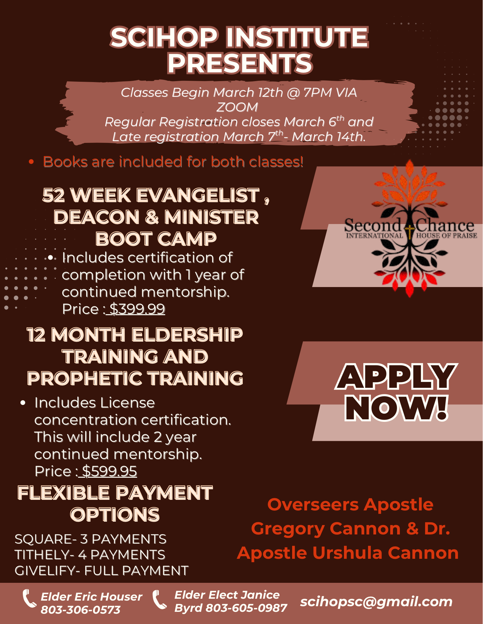 SCIHOP Institute offers faith-based leadership training designed to equip individuals for ministry and service. Programs include a 52-week Evangelist, Deacon, and Minister Boot Camp and a 12-month Eldership and Prophetic Training, both featuring certification and continued mentorship. Classes are held via Zoom with flexible payment options available.